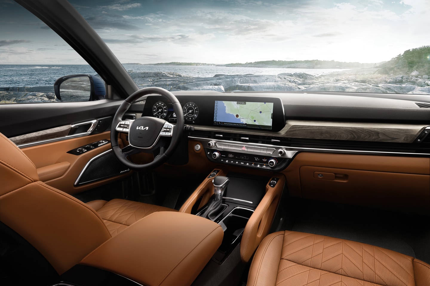 Inside, the 2026 Kia Telluride introduces a reconfigured cabin layout with upgraded materials throughout. A dual 12.3-inch panoramic display stretches across the dashboard, housing the infotainment system and digital gauge cluster under a single glass panel. Available Nappa leather, customizable ambient lighting, and redesigned second-row captain's chairs expand comfort for long drives between Delta and Aspen, CO. Families gain added convenience from an expanded third-row entry and new under-floor storage options that make packing easier for weekend escapes.